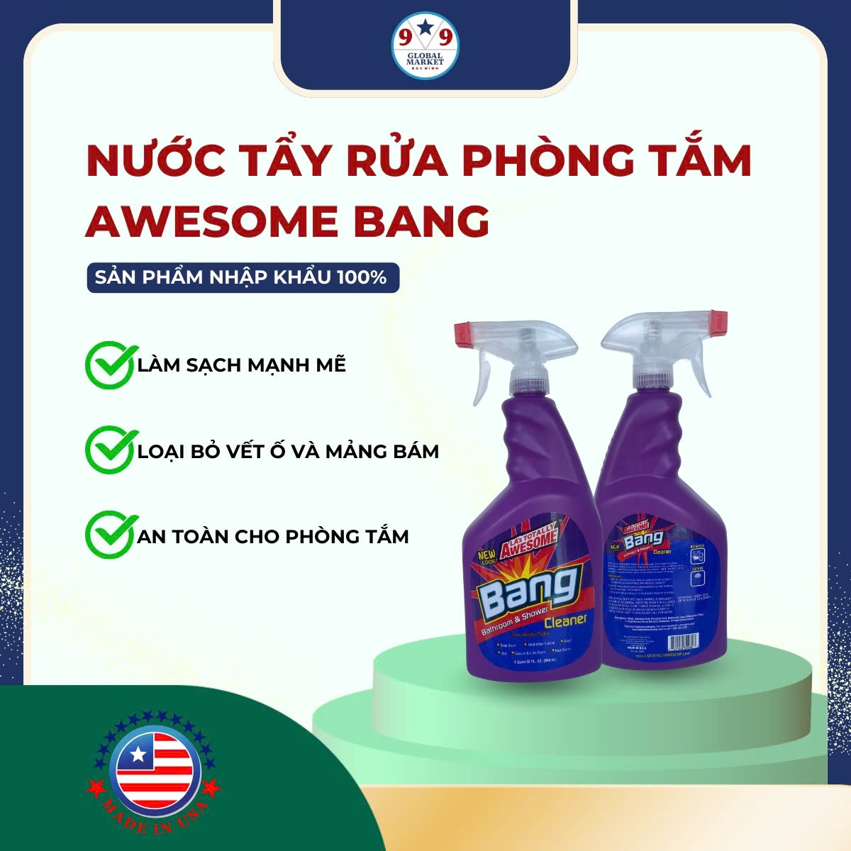Nước tẩy rửa phòng tắm LA's Totally Awesome Bang Cleaner 32 oz là sản phẩm làm sạch chuyên dụng, được thiết kế đặc biệt để loại bỏ các vết bẩn cứng đầu, xà phòng, mảng bám và vi khuẩn trong phòng tắm. Dạng chai xịt tiện lợi giúp bạn dễ dàng làm sạch mọi ngóc ngách.